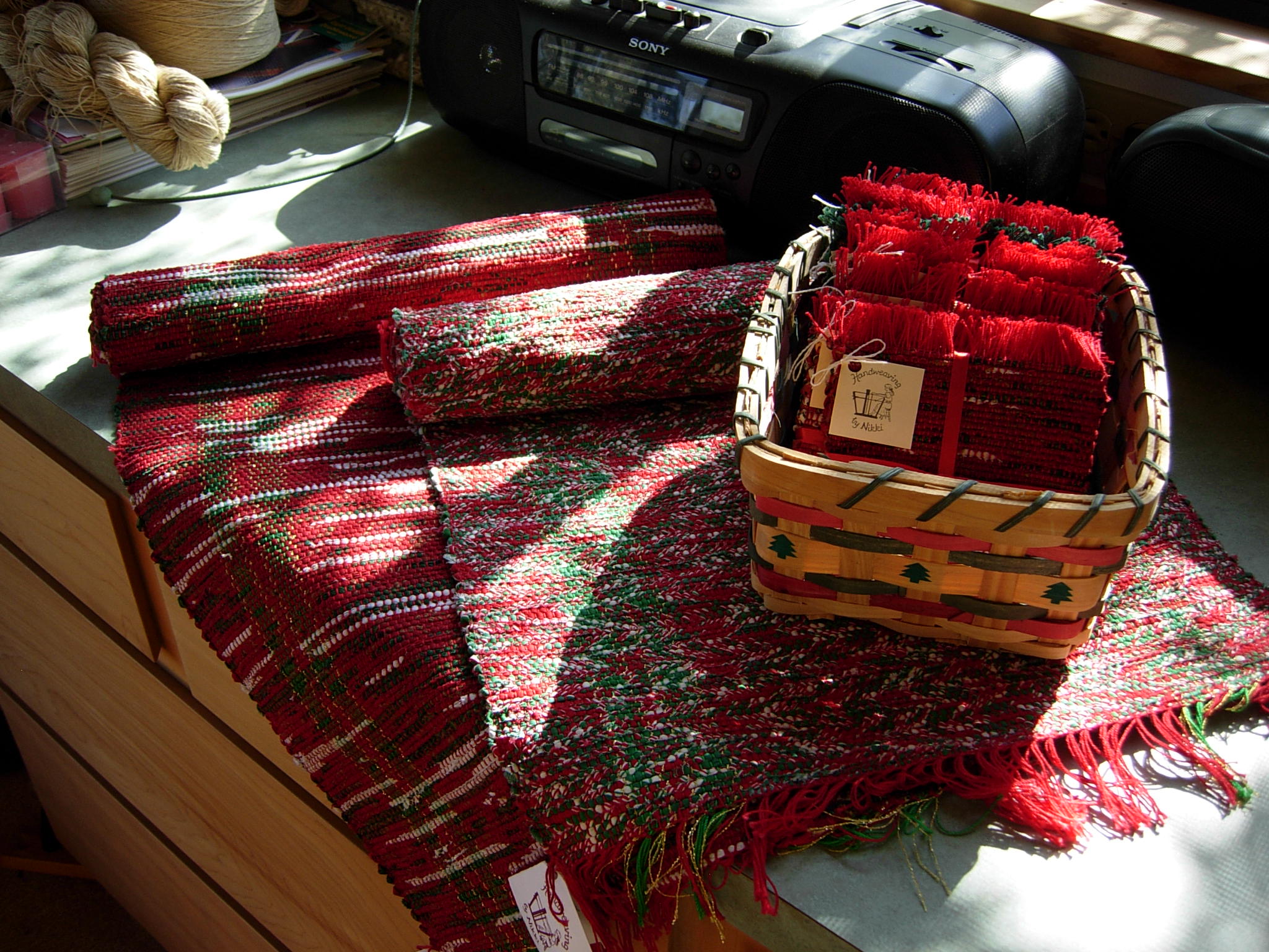 On the 1st Saturday of each month, my weaving studio is open to the public from 11 to 5. This is a picture of some of the things I usually have available. Here you see scarves and towels. There are also Mug Rugs, table runners, a lap robe and Mobius Shawls. You will see new projects on the 6 looms in the studio. Soon I will have another color gamp afghan made of thick luxurious cotton. I hope you will come by for a visit.