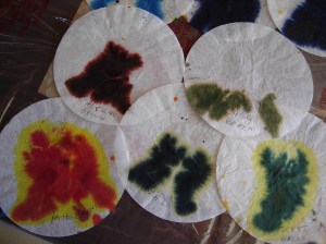 Because most colors are a combination of red, yellow & blue, I like to know what the underlying color is when deciding which dye to use.  I find that paper coffee filters are a good way to let the color separate out into its different components.  This way I know if a green has a stronger underlying blue or yellow hue.  This works for many different color combinations.