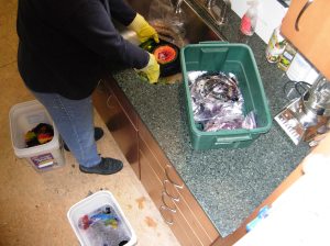 The next day proved the weather man wrong. The day dawned cold and overcast. I decided to do the rinsing in the (unfinished) kitchen.  On the counter in the dish pan are the rolled up chains wrapped in plastic.  I’m removing the plastic from one of the chains.  After being rinsed several times, the warp goes into the bucket on the floor to the right which holds a solution of Synthopol and water.  After a few more rinses, the warp chain goes into the bucket to my left.