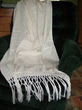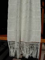 In order to give a little more movement and interest to the piece, the multi-colored stripes are shifted by 5 inches. The weft is two different yarns. One is a rayon chenille and the other a 5/2 perle cotton of the same color. The yarns alternate in plain weave using two shuttles. These two yarns together give the shawl a “hand” that is soft and luxurious (the feel of rayon chenille) and still lets the colors of the warp show through.